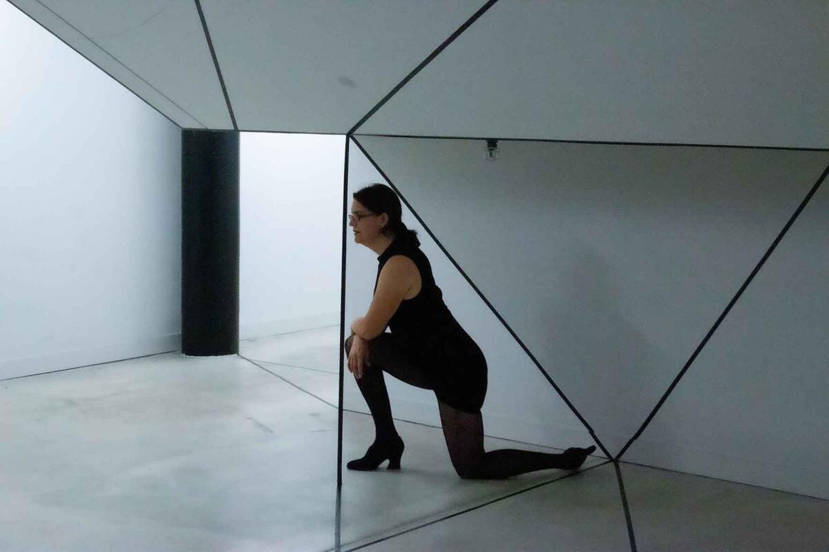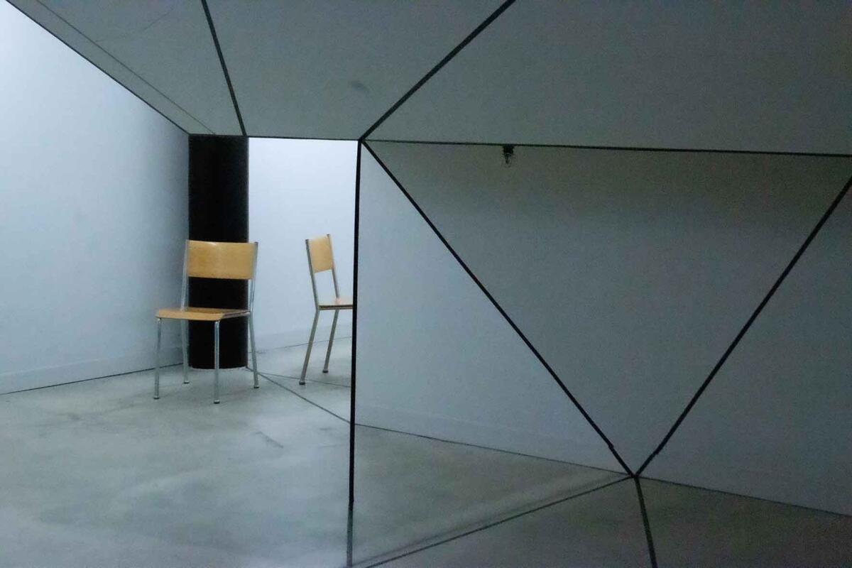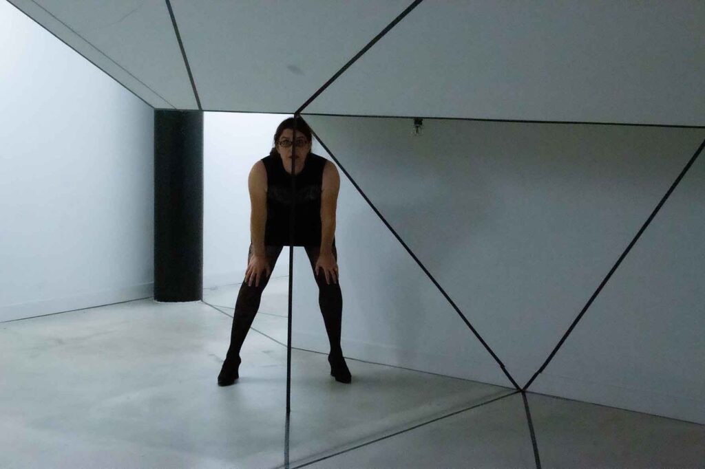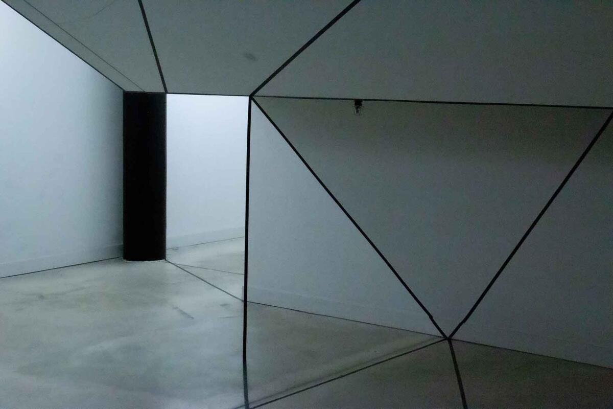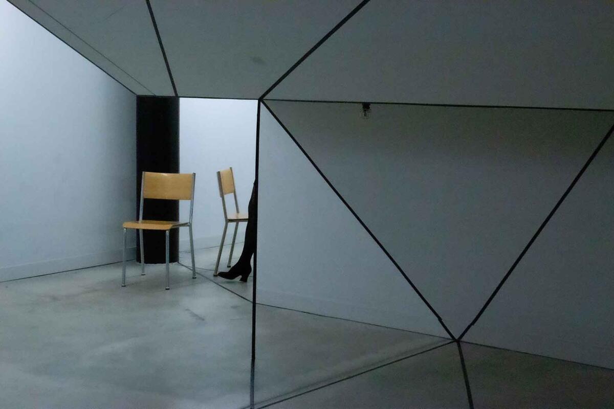 Die Irritation entsteht allein durch das Ziehen von reellen und logisch gedachten schwarzen Linien mit Klebeband. Sie wird verstärkt durch eine schlichte (Selbst-)Inszenierung im Raum: Eine Spielerei mit optischen Wahlmöglichkeiten.