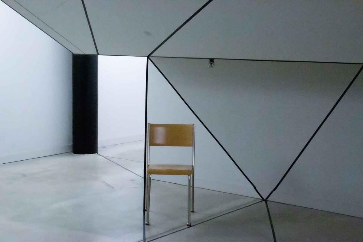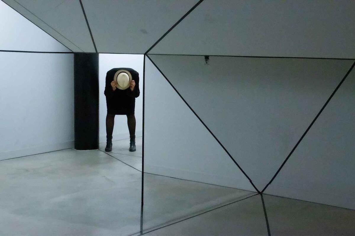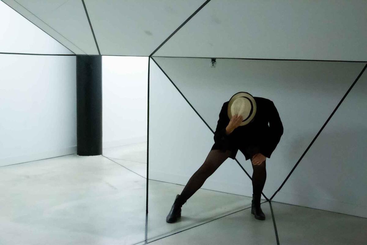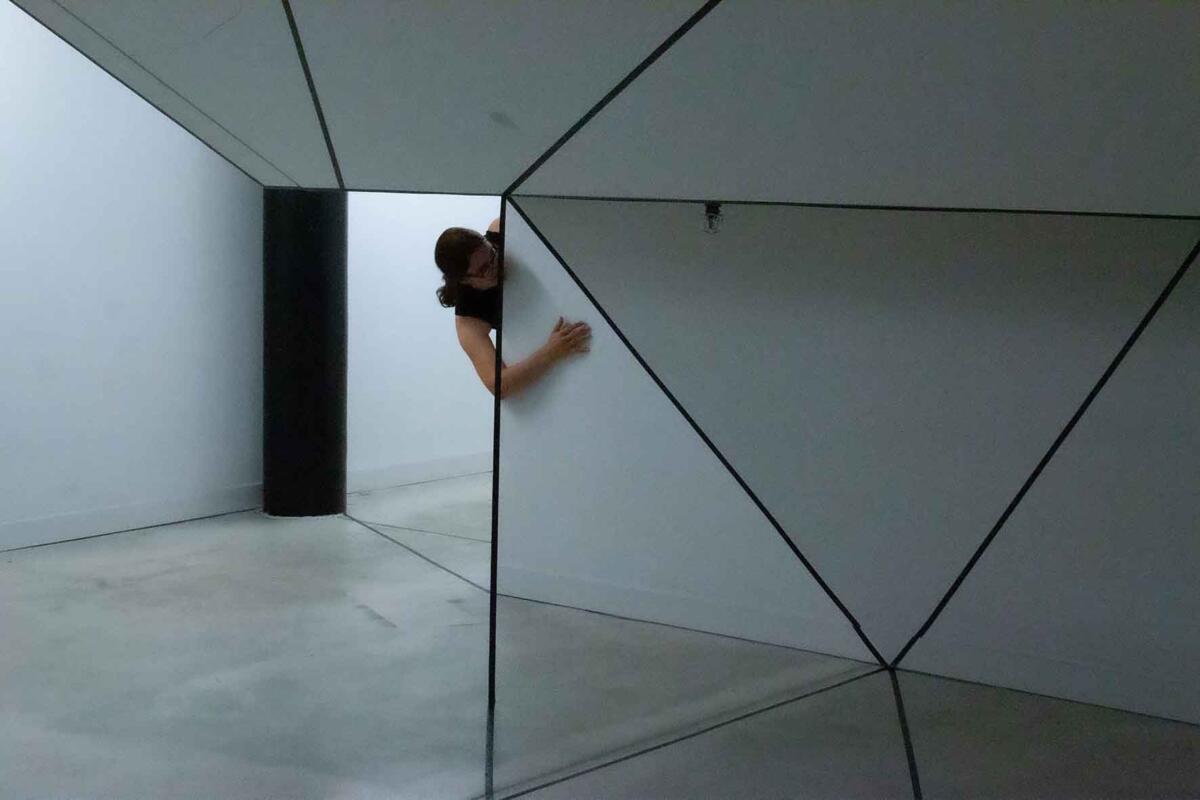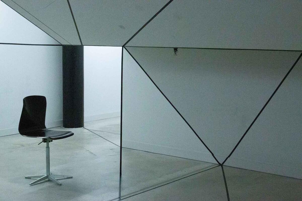 Die Irritation entsteht allein durch das Ziehen von reellen und logisch gedachten schwarzen Linien mit Klebeband. Sie wird verstärkt durch eine schlichte (Selbst-)Inszenierung im Raum: Eine Spielerei mit optischen Wahlmöglichkeiten.