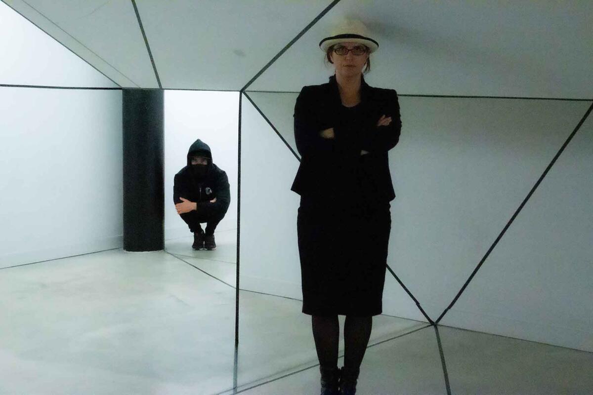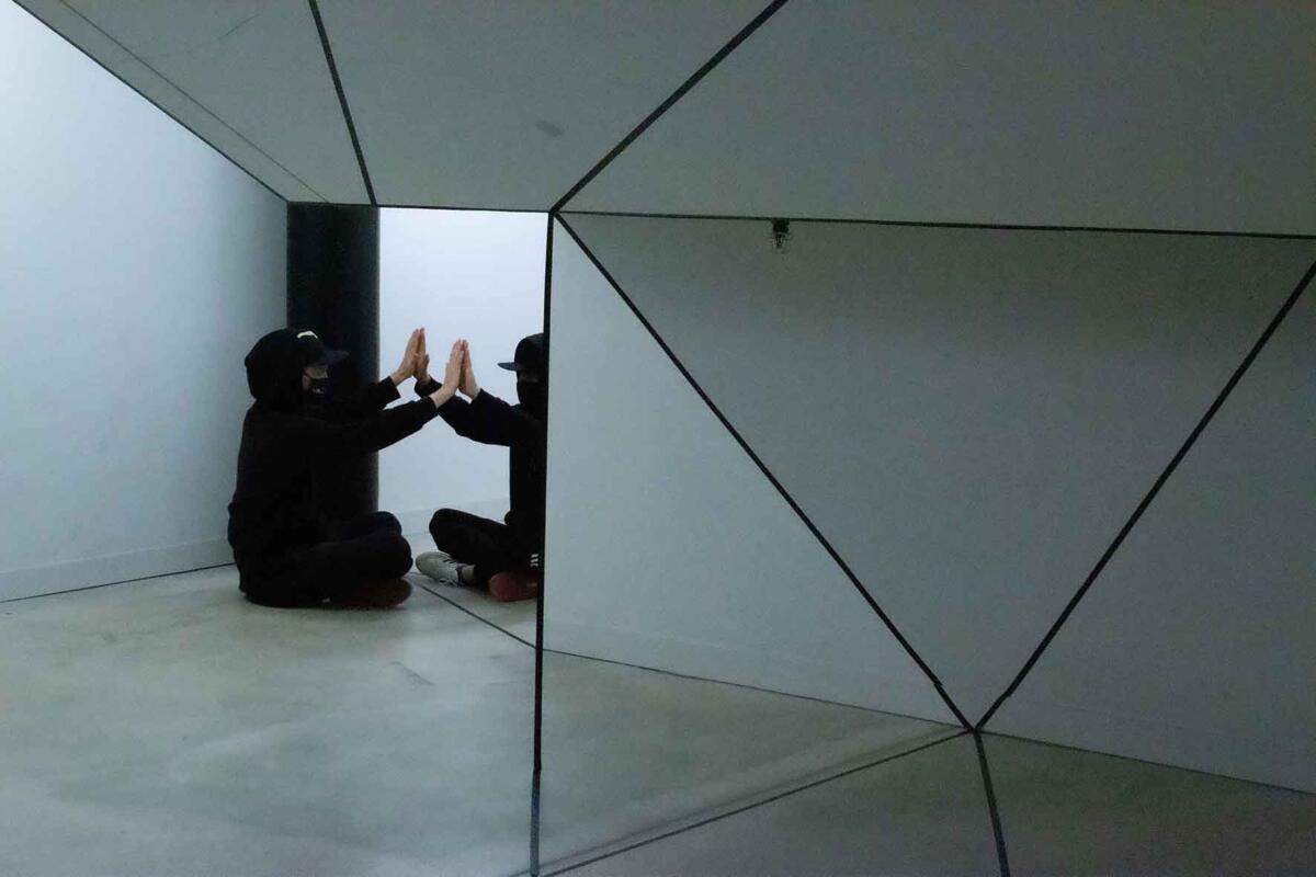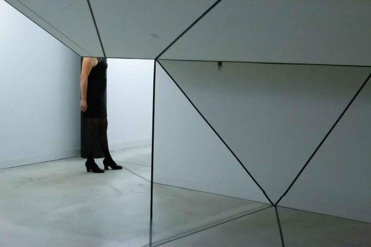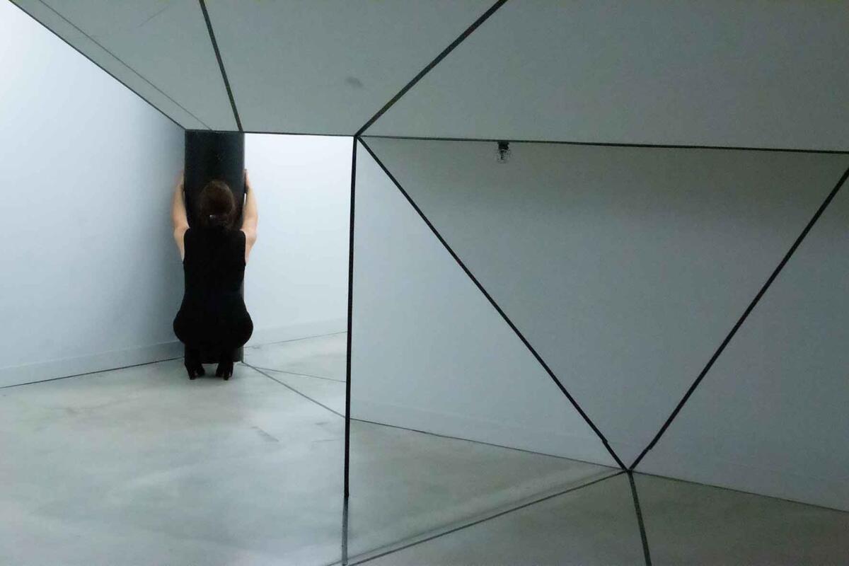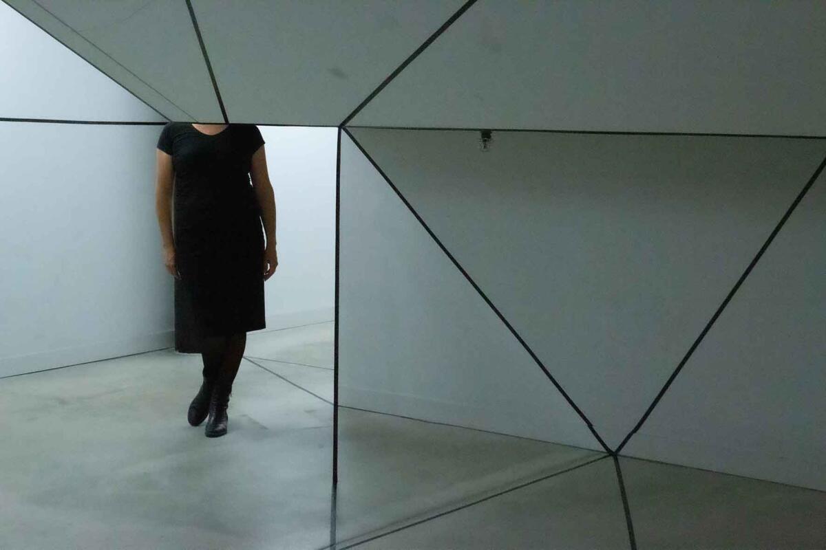 Die Irritation entsteht allein durch das Ziehen von reellen und logisch gedachten schwarzen Linien mit Klebeband. Sie wird verstärkt durch eine schlichte (Selbst-)Inszenierung im Raum: Eine Spielerei mit optischen Wahlmöglichkeiten.