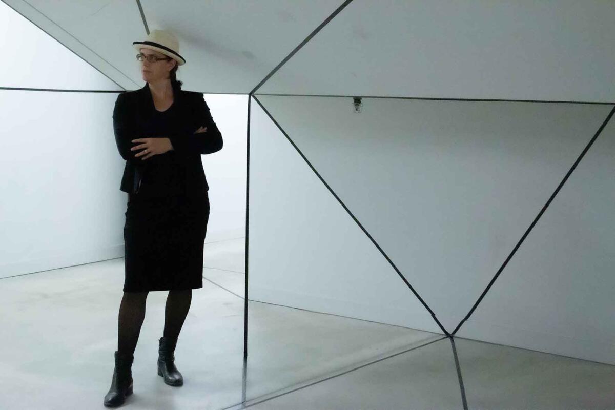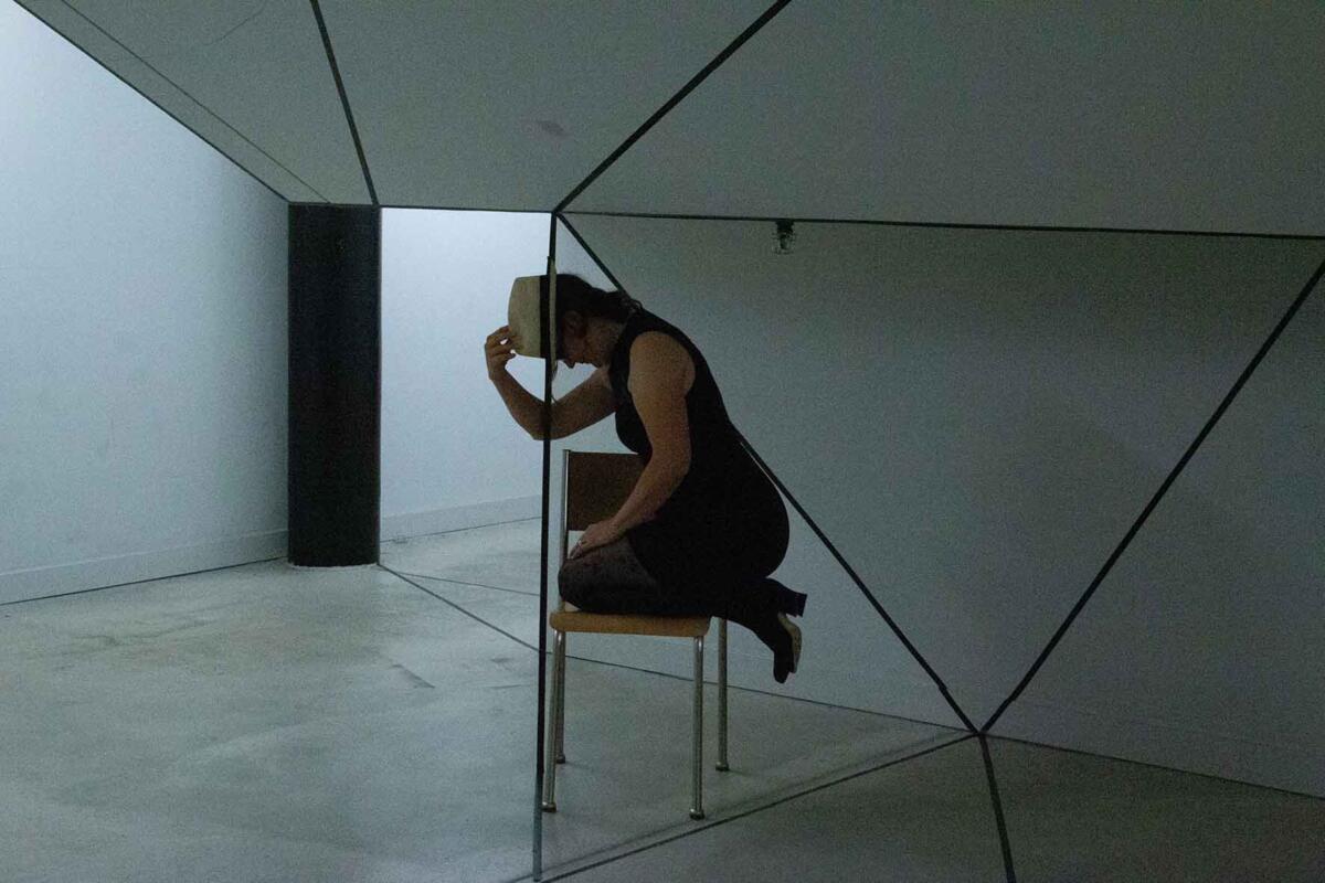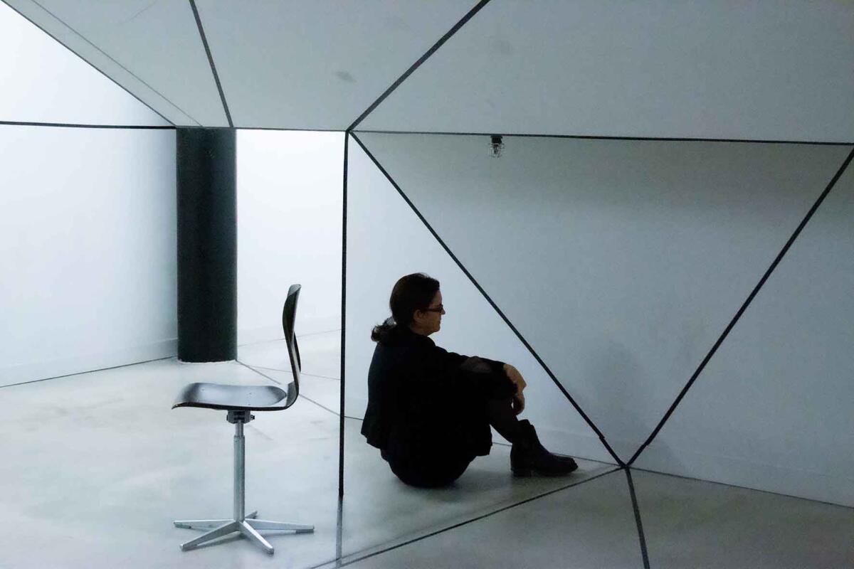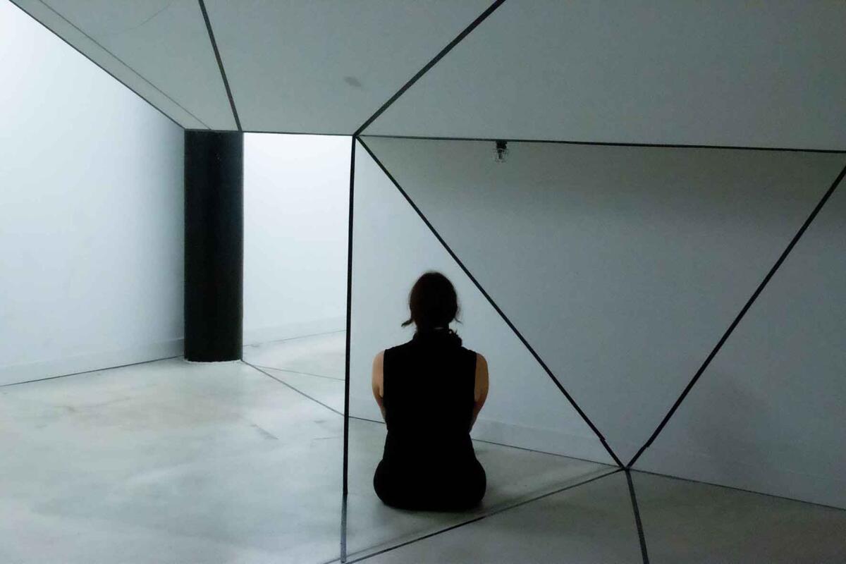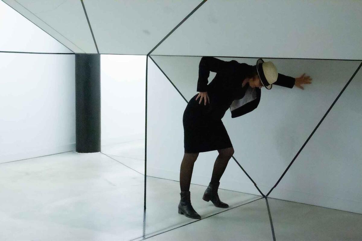 Die Irritation entsteht allein durch das Ziehen von reellen und logisch gedachten schwarzen Linien mit Klebeband. Sie wird verstärkt durch eine schlichte (Selbst-)Inszenierung im Raum: Eine Spielerei mit optischen Wahlmöglichkeiten.