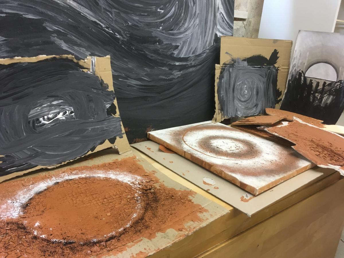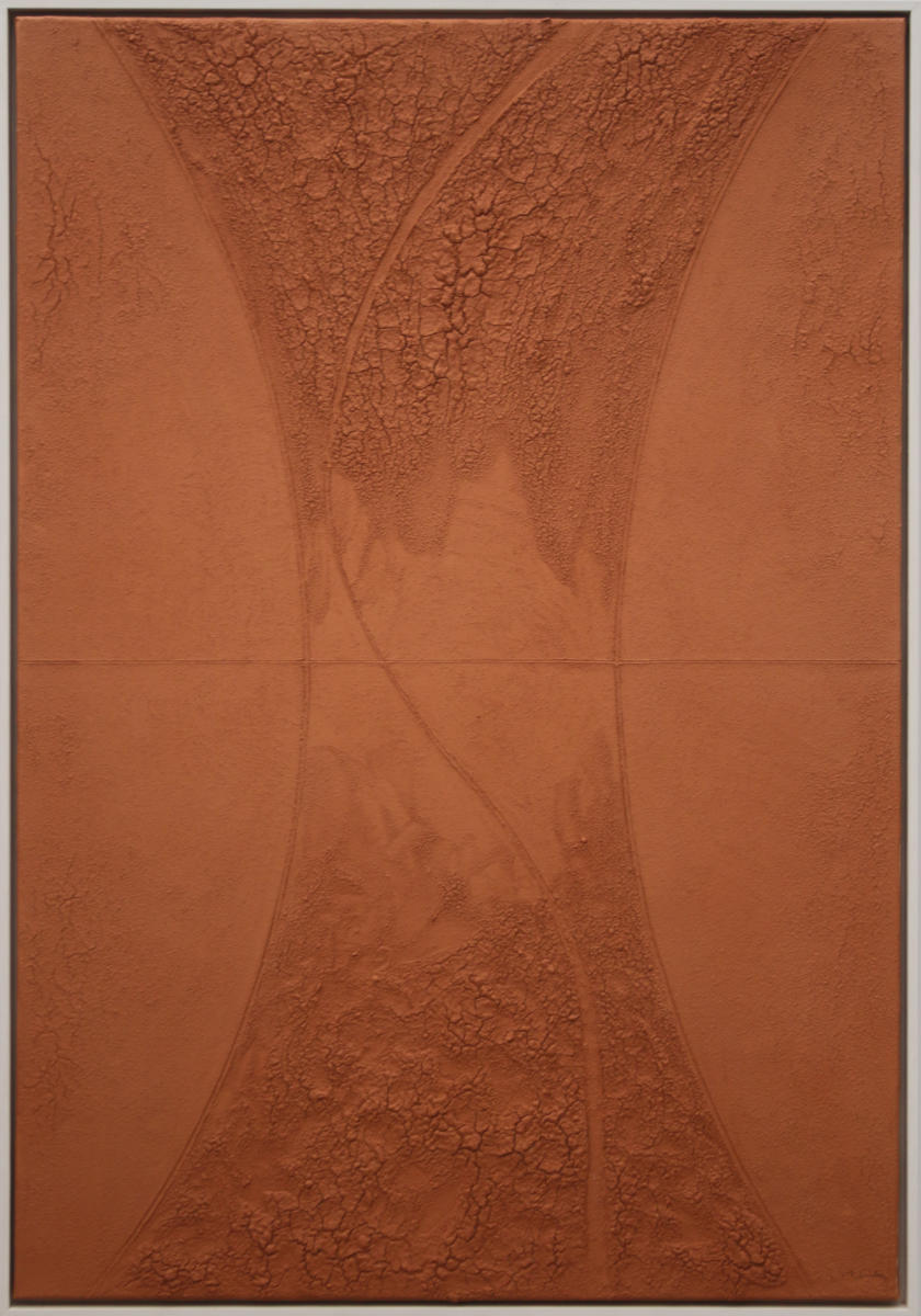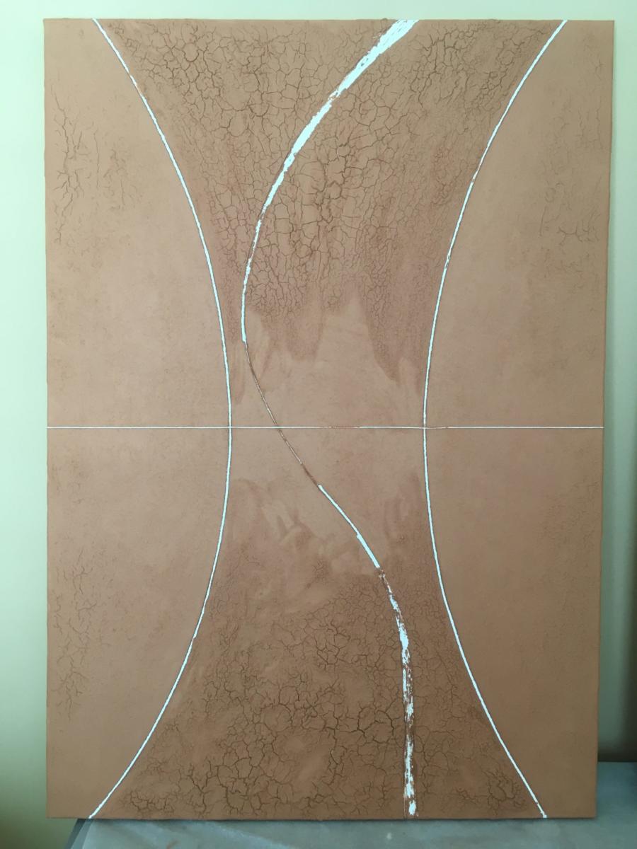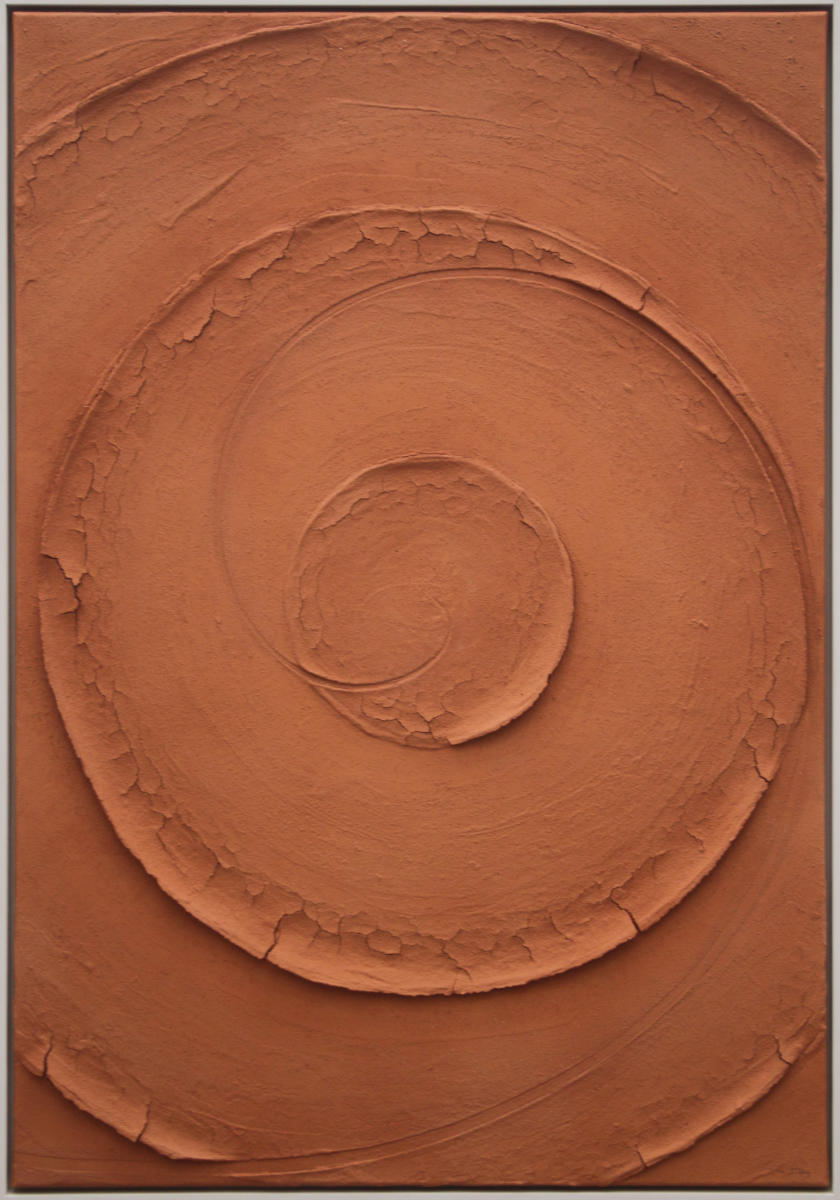 Erde hat eine starke Symbolkraft im Zusammenhang mit Tod, Vergänglichkeit und Sterben. Mit vielen Experimenten gelang es mir, eine Mischung herzustellen, die sich auf Leinwand anbringen liess und dennoch beim Trocknen die typischen Risse bildete. So konnte ich in meinen grossformatigen Bildern auf die Farbe verzichten und dieses wunderbare Material sprechen lassen.